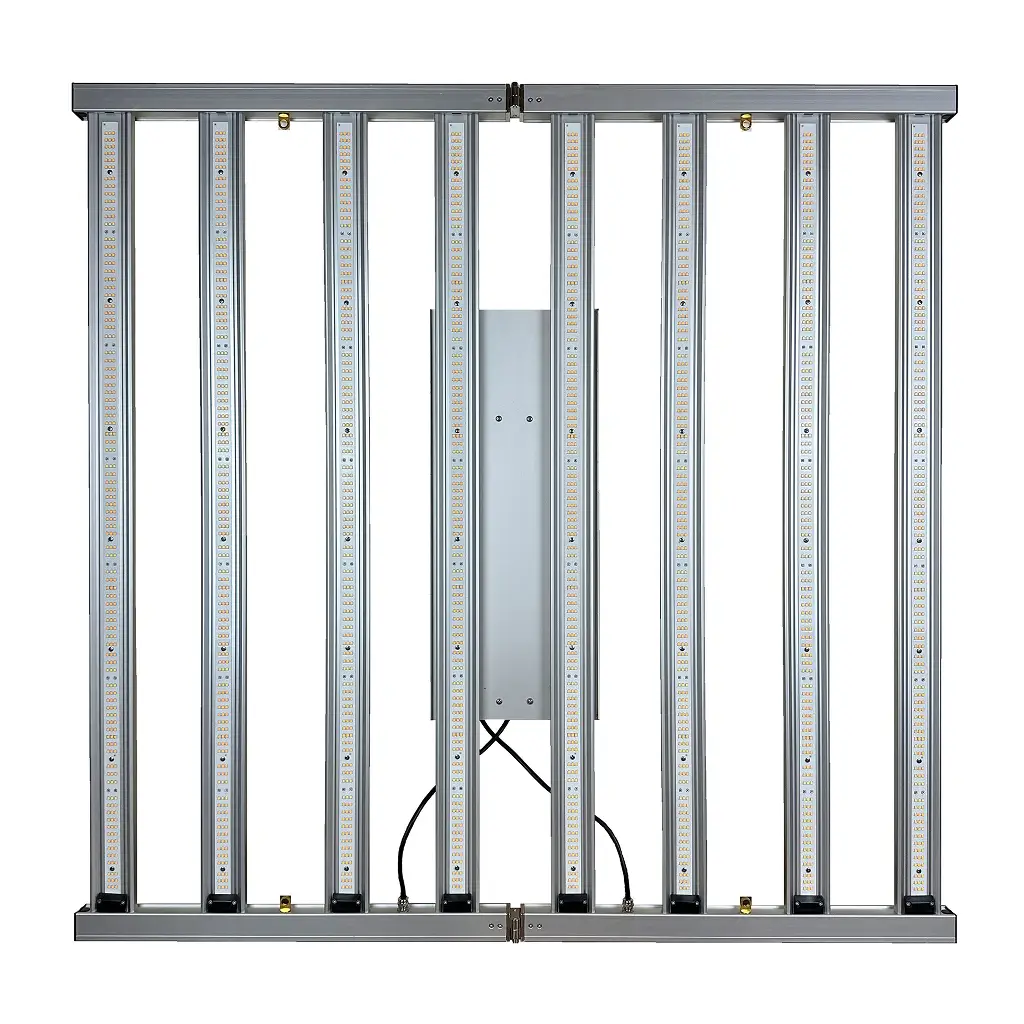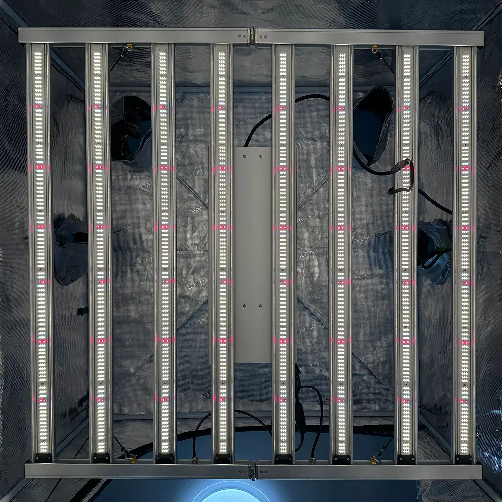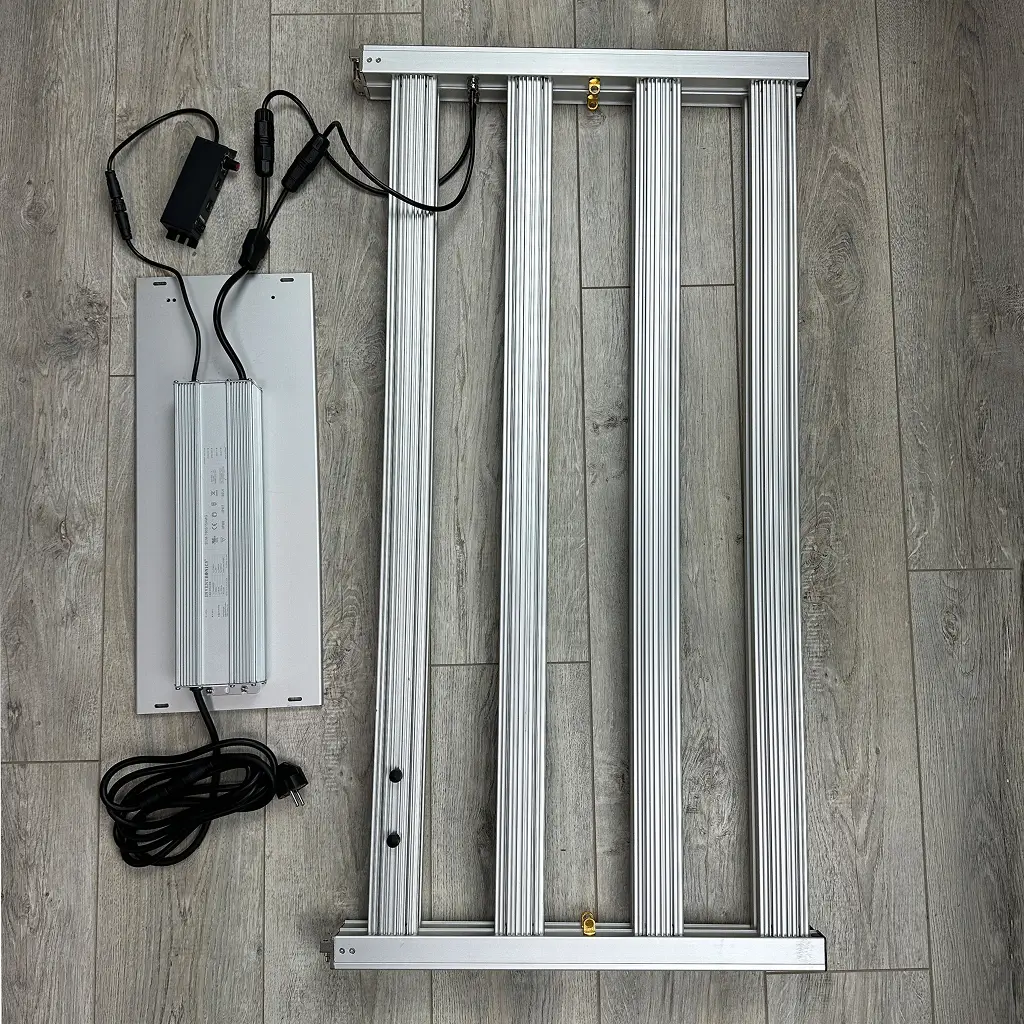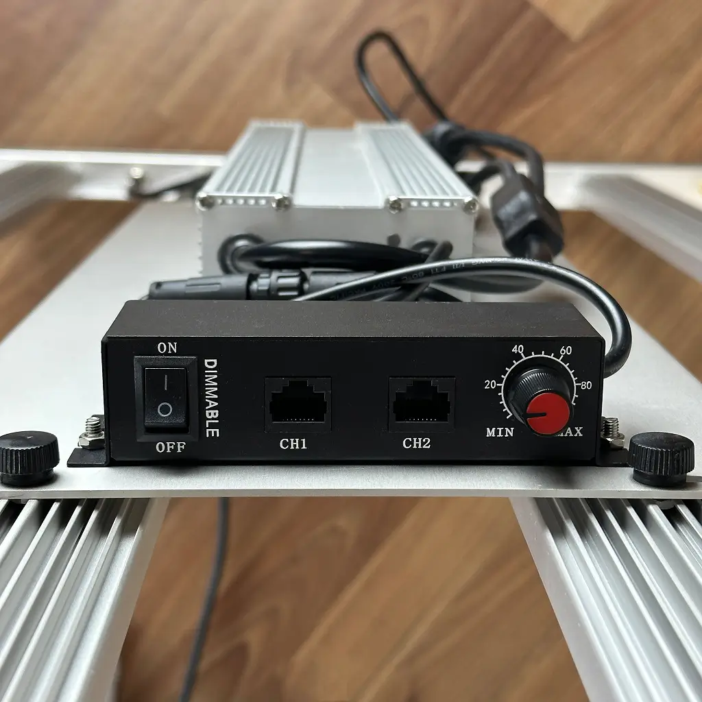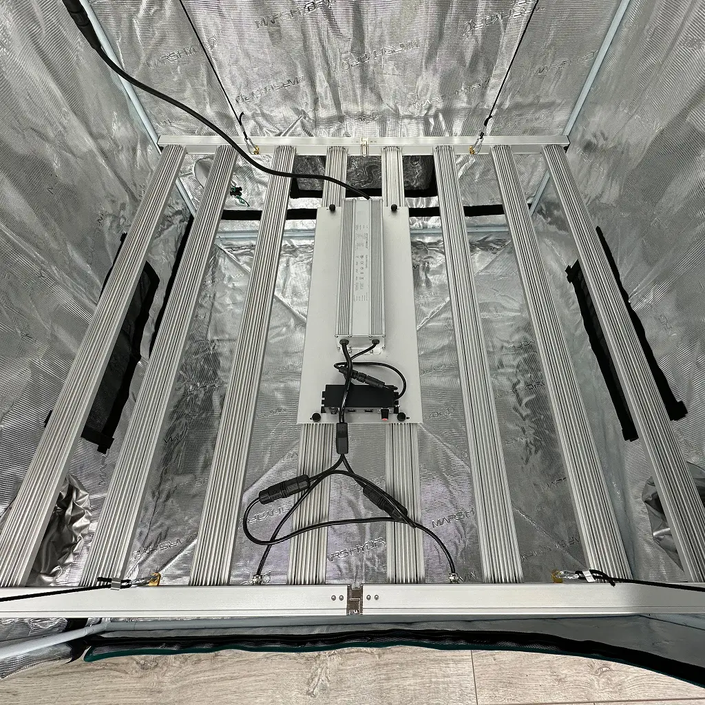 Завдяки розміру 110 × 110 см лампа чудово підходить для гроубоксів 120×120 см або 150×150 см. Пасивне охолодження з масивним радіатором забезпечує безшумну роботу, а захист IP65 гарантує стабільність навіть у вологих умовах. Регулювання потужності (0–100 %) дозволяє точно налаштовувати інтенсивність світла для різних фаз росту.