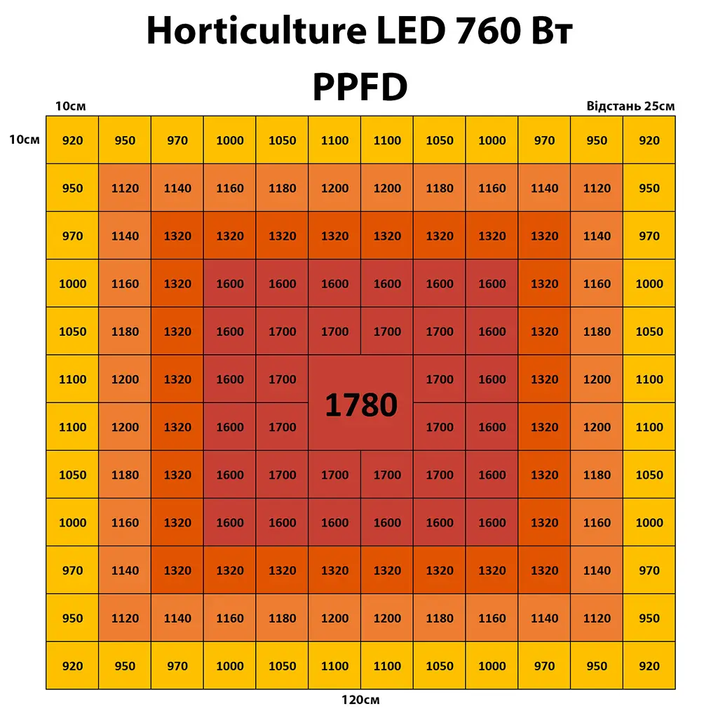 | PPFD | 1780 µmol/m²/s (виміряно у лабораторії наших партнерів, які спеціалізуються на освітленні понад 7 років)PPFD – це показник кількості фотонів світла, корисних для фотосинтезу, які потрапляють на 1 м² за секунду (вимірюється в µmol/m²/s). |